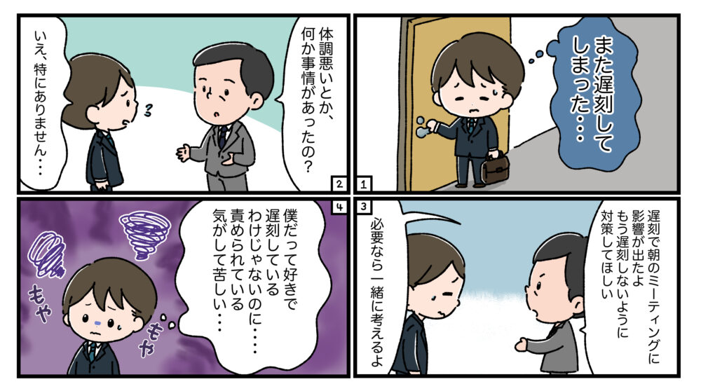 若手社員のAさんは日ごろから遅刻が多く、この日も寝坊で遅刻をしてしまいました。上司のB課長は特段の事情がないことを確認したうえで「もう遅刻をしないよう対策してほしい」と要望を伝えました。しかし、Aさんは「遅刻したくてしている訳ではないのに『ミーティングに影響が出た』など責めるようなことを言われて苦痛だ。これはパワハラではないか。」と感じています。